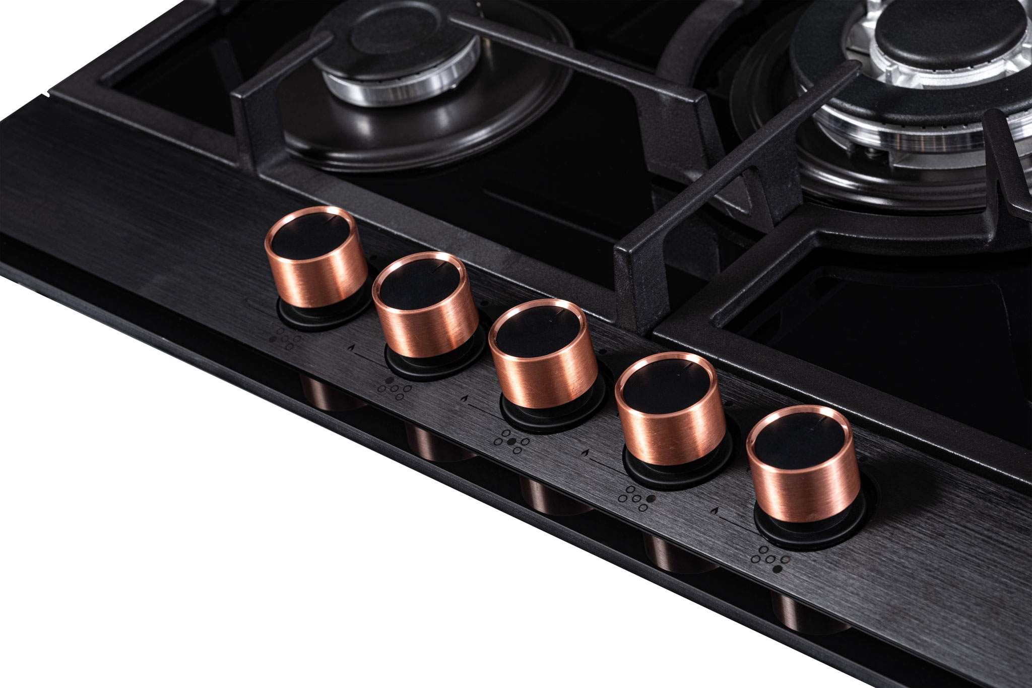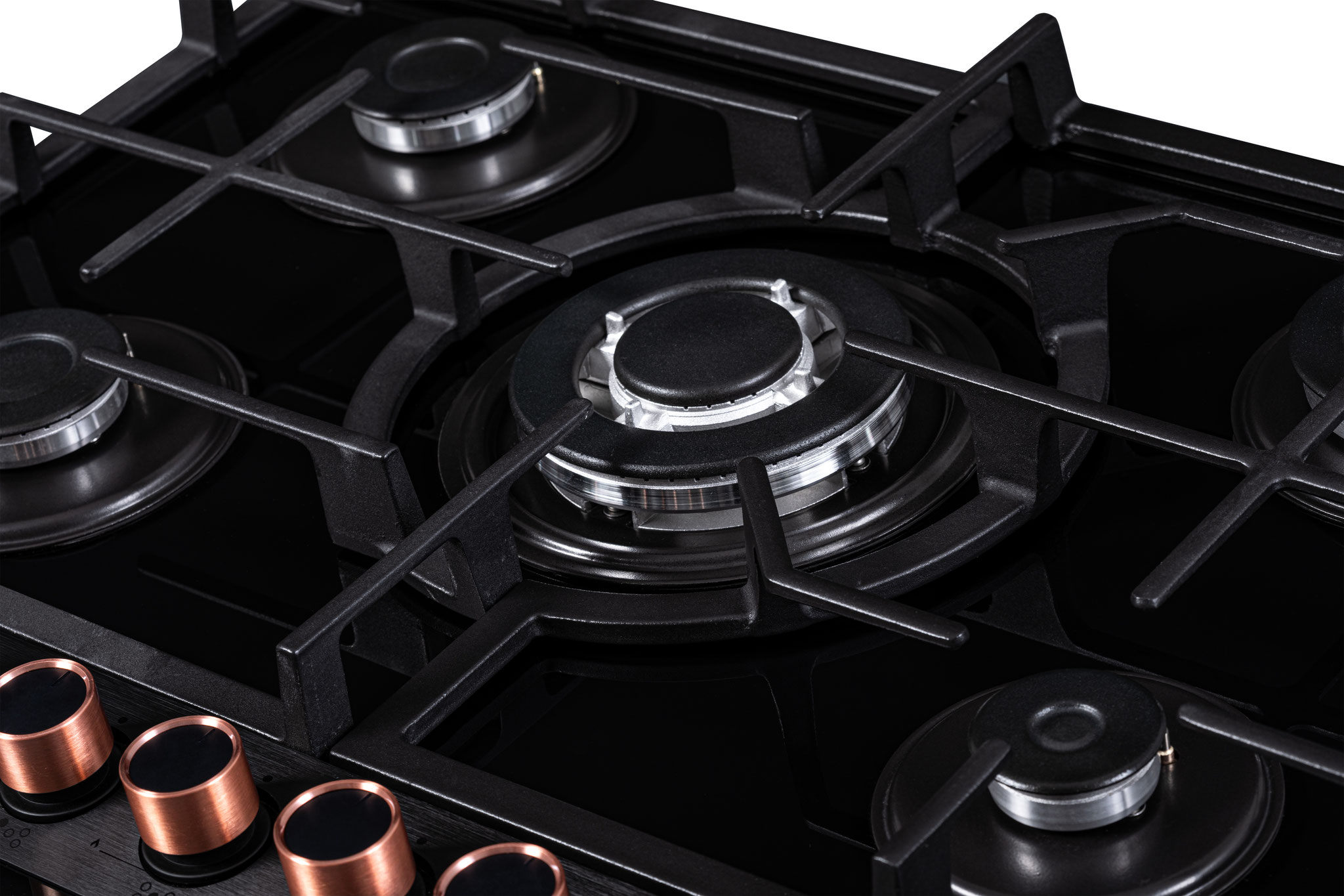 Dankzij de éénknops vonkontsteking wordt koken comfortabeler dan ooit: met één hand draai je de knop om en activeer je direct de vlam. Het geborstelde zwarte bedieningspaneel met zilverkleurige knoppen geeft de kookplaat een verfijnde, tijdloze uitstraling. Bovendien wordt er een extra set koperen knoppen meegeleverd, zodat je het design kunt personaliseren naar jouw smaak.