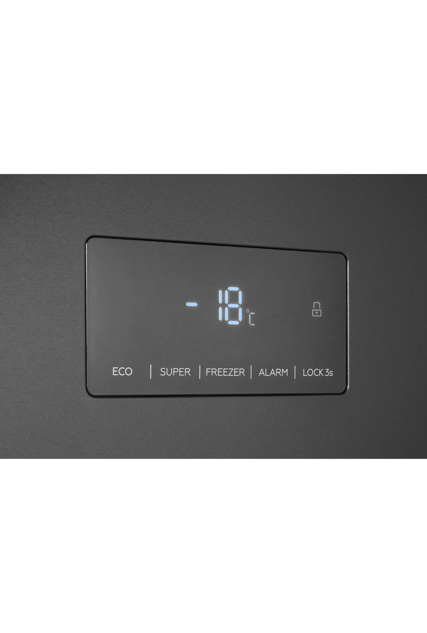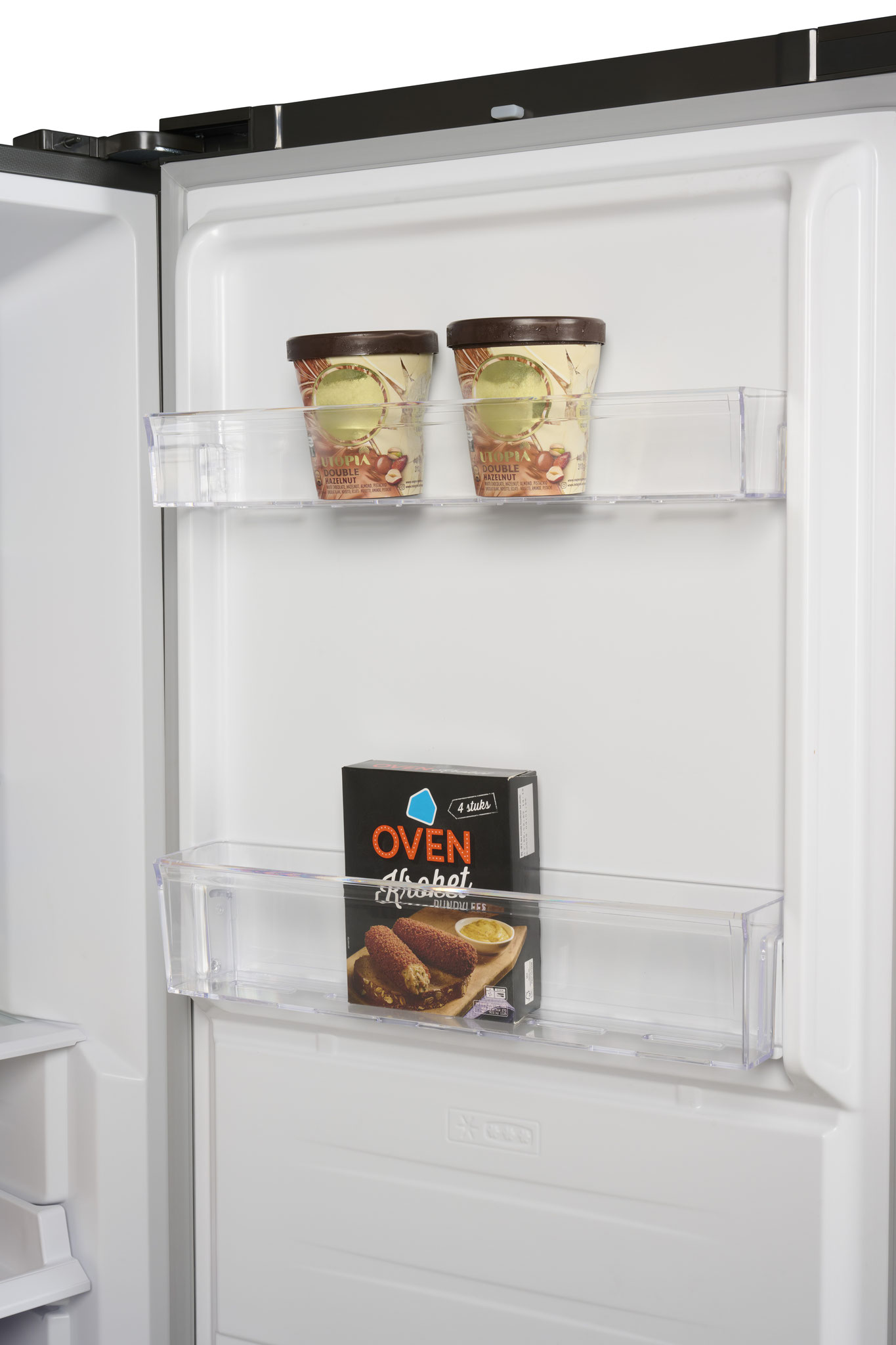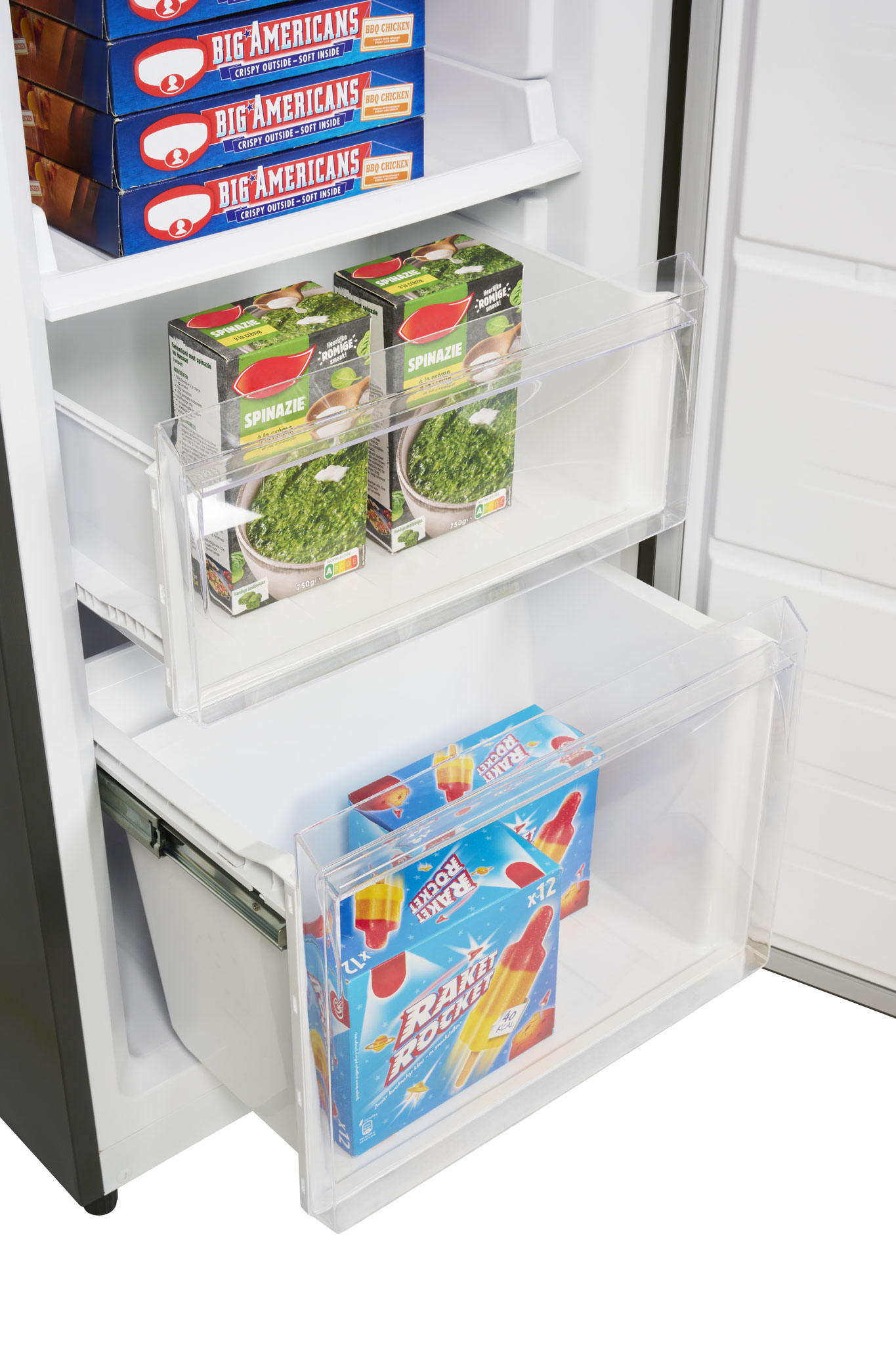 Binnenin is de vrieskast overzichtelijk ingedeeld met 4 transparante lades en 3 schappen, zodat je al je producten netjes kunt organiseren. De heldere LED-verlichting zorgt voor optimaal zicht, en via het display op de deur kun je eenvoudig de temperatuur aflezen en instellingen aanpassen zonder de deur te openen.